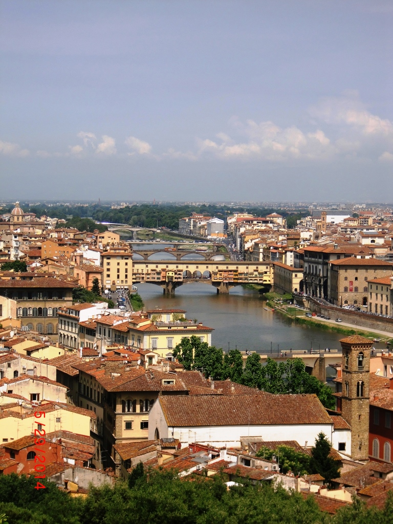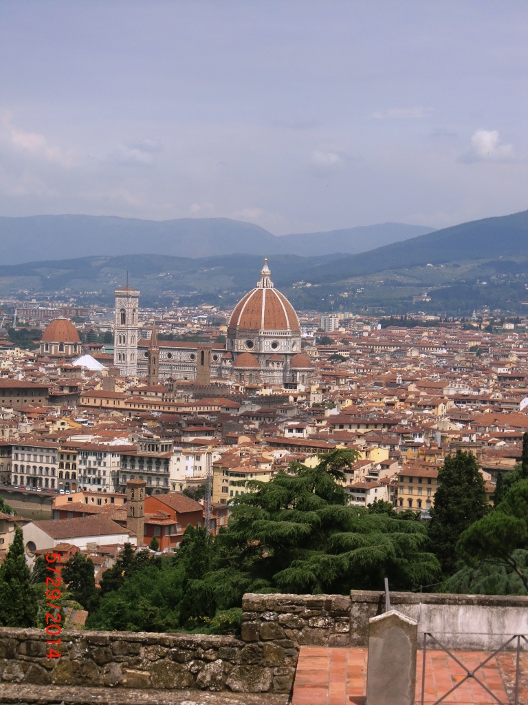 Florence spread before us, a 180 degree panorama. The domes rose from the red tile roofs, the city bordered by the green Tuscan hills of Mary’s May. The skies were blue for the moment, a celestial dome much more expansive than Brunelleschi’s, an opening between billowing clouds blown by the wind.