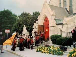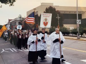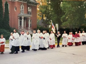 We gathered beneath the turning leaves, shade trees still green but hinting of gold, an aura of promise. Otto carried the flag, a large triumphant one, suitable to his size, and already the breeze played with it. The bishops, their crimson capes flashing against their white cottas, mingled and waited regally. The local high school band, neatly proud in their uniforms, gathered and took their place in the line-up, the tuba, as always commanding the center of attention. We lay folks fell in behind the band, the white robed clergy behind us, followed finally by our leaders coming last, our apostolic episcopate.