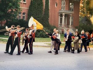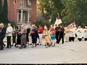 We walked slowly, singing as best we could, some with amber tenor and contralto voices; others, like myself, squeaking along in earnest. The breeze picked up, and the flag unfurled. A video man stood on the corner, catching our moment in history, our very American statement this Saturday morning, on the main street of Fond-du-Lac, Wisconsin. It was only four blocks, but they were momentous blocks to me. I realized my short temporal life meant something when joined with the eternal, and how little it meant otherwise. Somehow, all of us, united through God, and soon once again through his Eucharist, became holy, a part of the universe, an integral piece of time and history. And the cementing factor was love, his love, a love that blew through us as it blew through the trees about us. A summer love, hinting at fall. As the old song went, the times they are a changin’…Would I have felt the same parading for the March of Dimes? Certainly, I would have felt virtuous, but holy? No, I do not think so. This day I felt holy, whole.