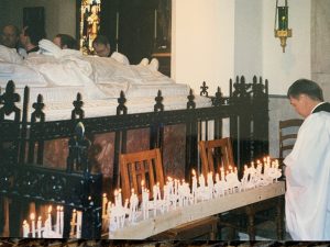 Now, in this historic cathedral, one of the priests walked down the aisle lighting our candles, and we continued the flame along our row, bending the candle deftly to catch our neighbor’s wick. We stood, holding our white rods of fire, waiting. Then, slowly, we followed the procession around the church, under the jutting angels, slowly placing one foot in front of the other, chanting the Litany of the Saints: O God the Father of heaven: Have mercy upon us. O God the son, Redeemer of the world: Have mercy upon us. O God the Holy Ghost: Have mercy upon us. O Holy Trinity, one God: Have mercy upon us. Holy Mary: Pray for us…Saint Michael: Pray for us.  Saint Gabriel: Pray for us…The voices boomed through the cathedral space, this sanctuary of God. I thought of the abortion pill. I thought of the large coven of witches here in Wisconsin. I thought of Saint Michael throwing Lucifer out of Heaven. We held our candles firmly in this dark space, a band of ragtag lovers, lighting the darkness with God. We moved down the side aisles to the Shrine of Bishop Grafton.  There we placed our candles in troughs of sand. There, below his carved stone effigy, lying spread out over his tomb, the flames burned brightly, and we prayed to this bishop of faith and order, the saint who knew the life-giving importance of the Blessed Sacrament.