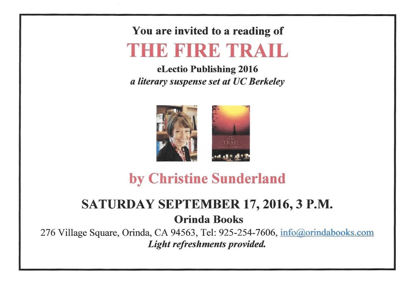 Christine presented and read from The Fire Trail, set at UC Berkeley, on Saturday, September 17 at Orinda Books. The brave audience beat the record heat wave temps, coming from many parts of the Bay Area. Many thanks to eLectio Publishing and Orinda Books and all those who attended!
